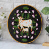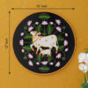 Awash in rich colors, this pichwai painting showcases a mother cow and her calf, surrounded by an abundance of blossoming flowers. This hand-painted artwork is a beautiful representation of nurturing love and the interconnectedness of life and nature.